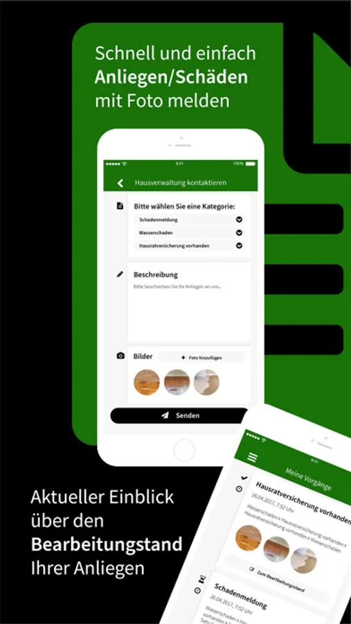 Als Mieter oder Eigentümer können Sie Schäden oder Anliegen direkt mit Fotos über unsere App melden. Ihre Anfragen stehen unseren Mitarbeiten dann zur Verfügung und können auch an Handwerksbetriebe weitergeleitet werden.