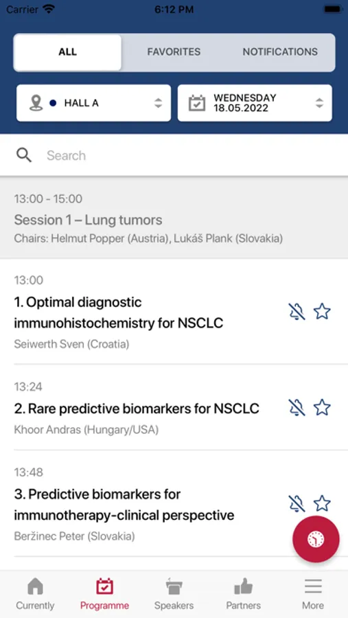 The program is structured according to the time schedule, individual halls and lecturers / chair persons that can be searched for. With the help of the "Favorites" tab it is possible to create your own program. With the help of the "Notifications" tab it is possible to add notifications for individual lectures.