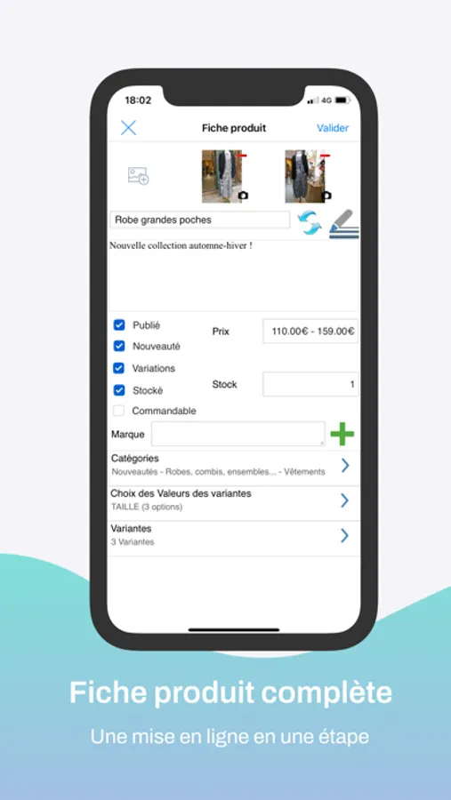 Vous aurez simplement à créer l'article, prendre les photos avec votre smartphone, dicter la description, saisir le prix et le stock, définir les variantes (tailles, couleur) s'il y en a et pour terminer cliquez sur Valider.