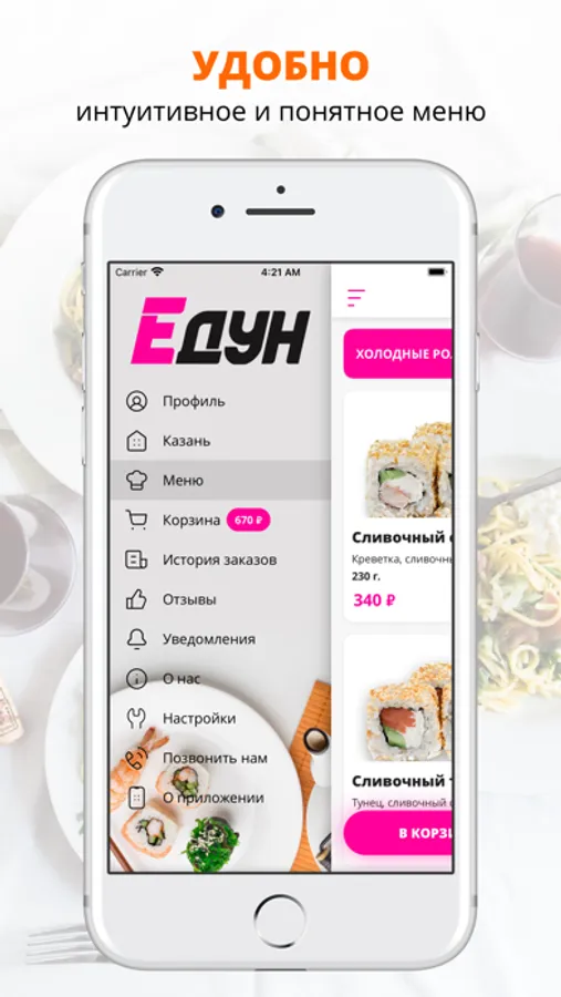 Приложение ЕДУН — это удобный способ заказа еды домой или в офис! Мы готовим наши блюда из качественных свежих ингредиентов и доставляем еду быстро и бережно.