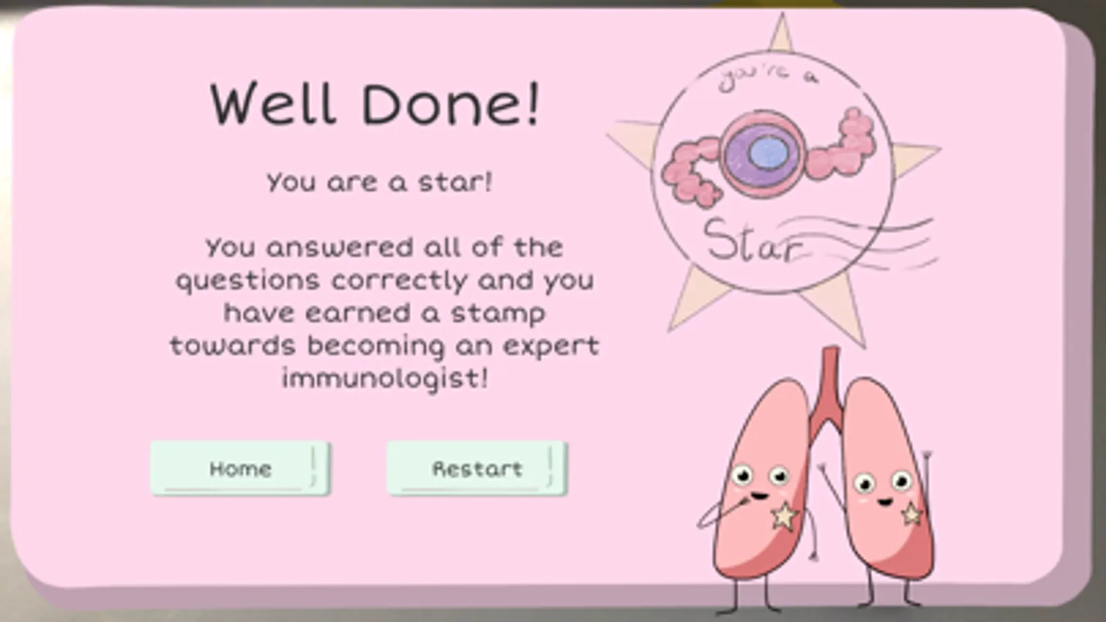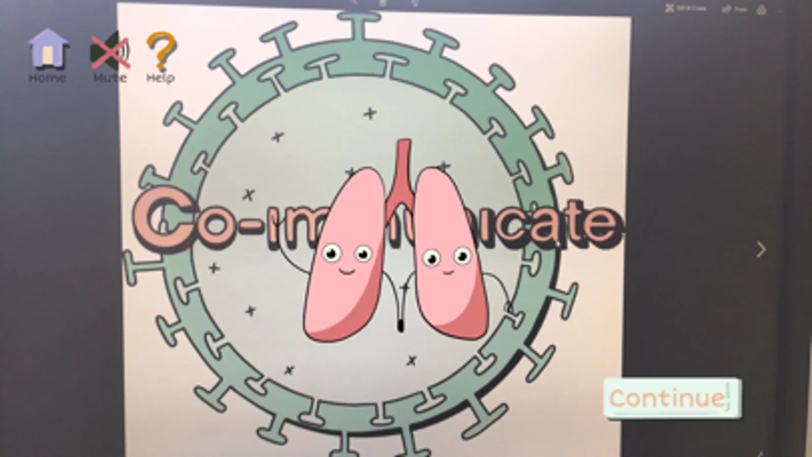 Welcome to our Co-Immunicate App. Here you can learn about how your immune cells and molecules protect against viruses that try to infect your lungs. Use augmented reality to learn about how immune cells can protect you, test your knowledge with fun quizzes and play our game, cell Defender to catch the infecting viruses!