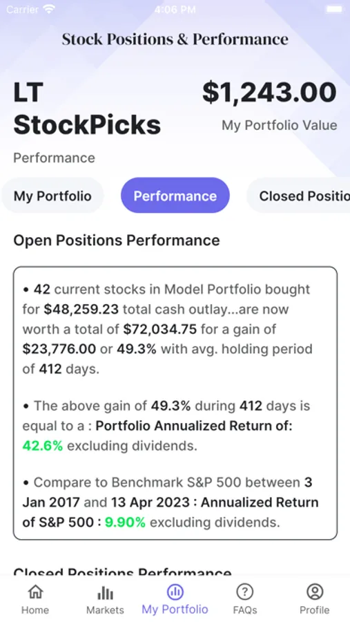 You will be surprised at how simple and profitable this Mechanically-Traded Model Portfolio of mine is. I am not after the quick profit in "fast-moving" stocks, but rather a fairly steady rock-solid return by buying stocks that have just started their upward move, which has typically been fairly lengthy. This page is auto-updated thru the day. since this is a long term portfolio, timely entries/exits are not that critical in the portfolio's overall performance results.