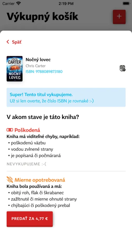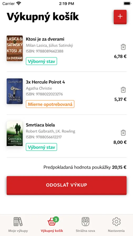 Oskenujte celú vašu knižnicu a vďaka funkcii Knižná sova si môžete do zoznamu odložiť aj knihy, ktoré práve nevykupujeme. Keď začneme, dozviete sa o tom prostredníctvom našej aplikácie a knihy môžete pohodlne rovno presunúť do výkupného košíka.