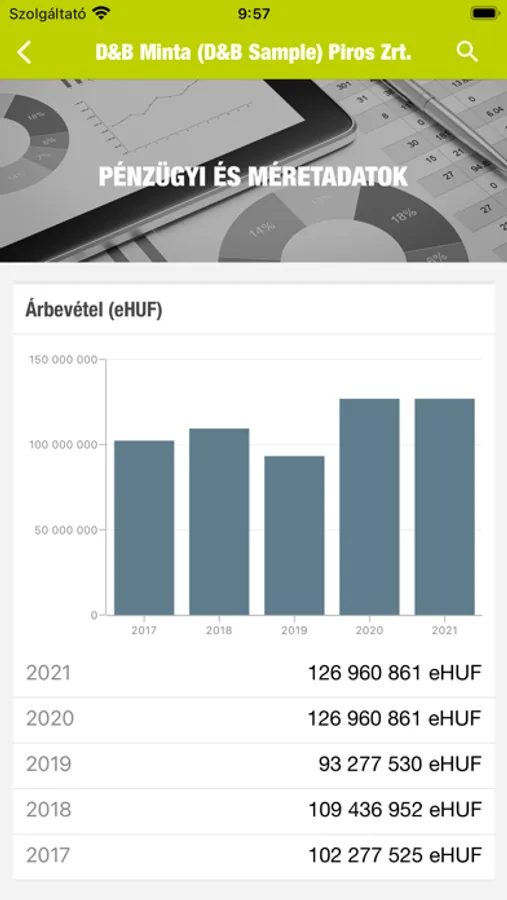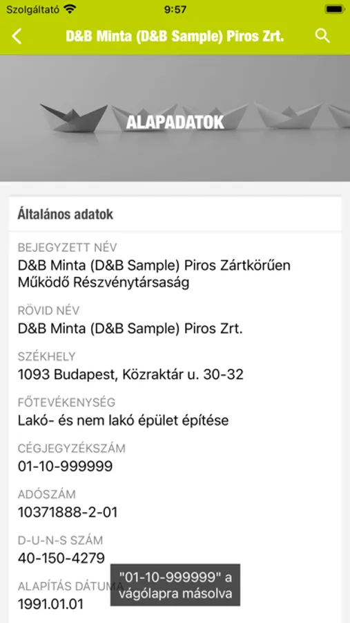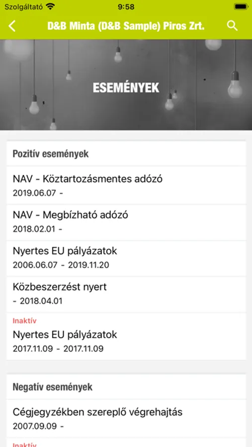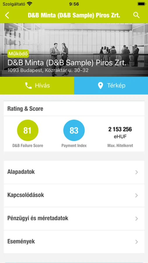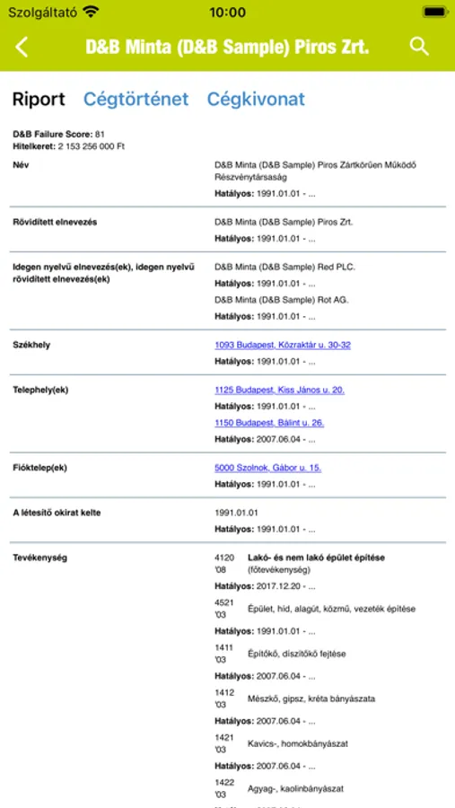 Az alkalmazás segítségével olyan információkhoz férhet hozzá, mint a szervezet székhelye, fő tevékenysége, legfrissebb árbevétele, alkalmazotti létszáma, adószáma, bankszámlaszáma, illetve hogy van-e ellene valamilyen negatív esemény.