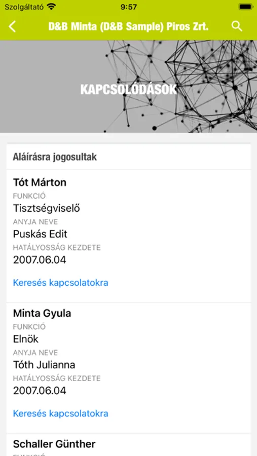 Megfelelő jogosultság esetén kereshet kapcsolatokra, valamint megtekintheti a vállalkozás kapcsolati gráfját és riportját/cégtörténetét/cégkivonatát.