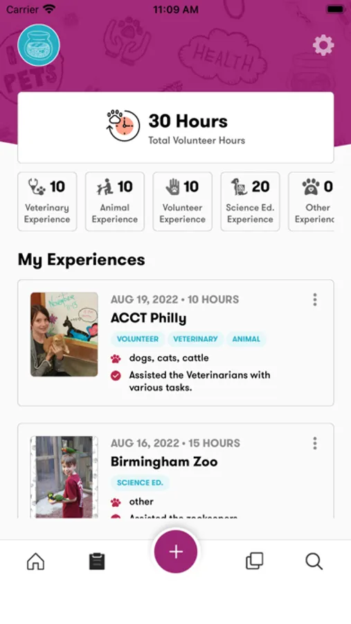 You can easily track your daily hours, along with dates, the animals you worked with and notes on the specific experience you added.