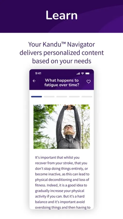 Kandu Health serves people returning home from the hospital after a stroke. Kandu offers remote clinical support through a licensed clinical Kandu Navigator and our easy-to-use app. Kandu delivers personalized education and resources, connection to other survivors and care partners and tools to manage your life after stroke.