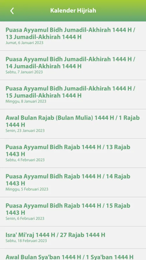Fitur yang tersedia adalah Qur'an, Hadits, Panduan Umrah/Haji, Arah Qiblat, Jadwal Shalat, Tasbih, Kalkulator Zakat, dan Kumpulan Doa.