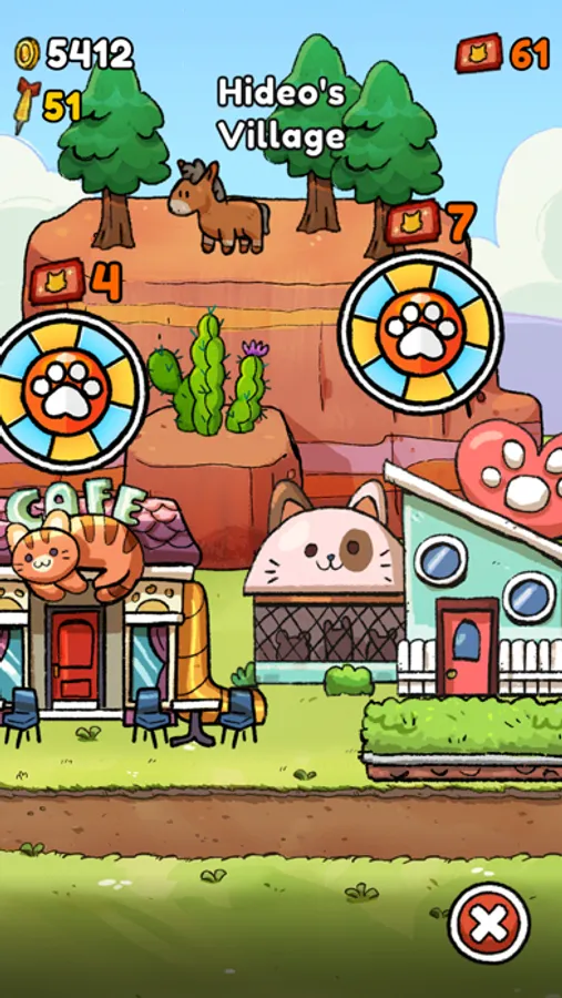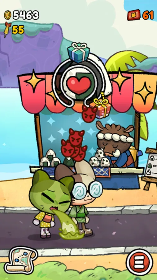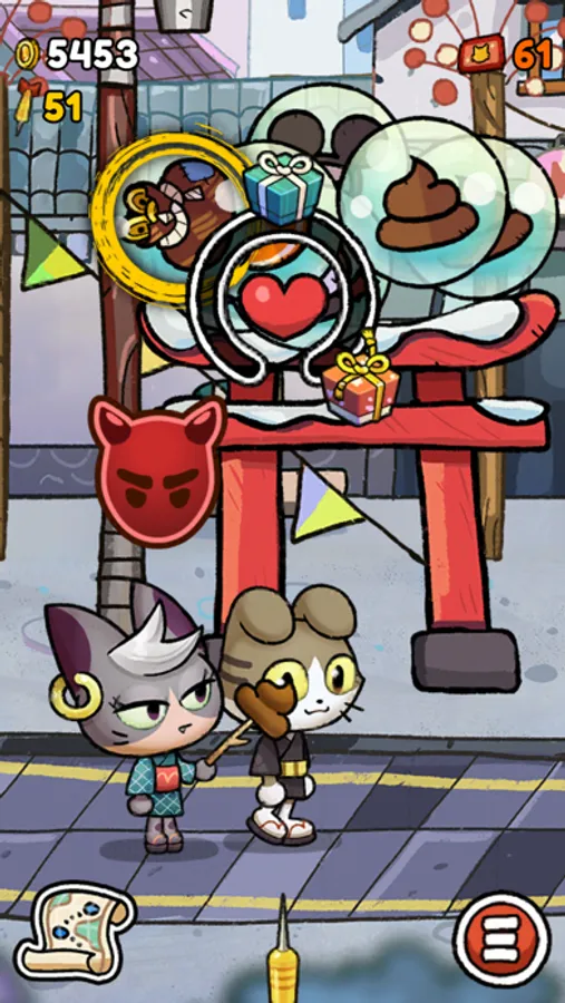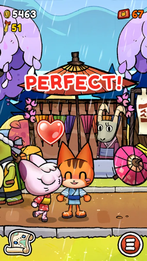 Kimono Cats is a charming, easy to play game for all ages. Select your main-character cat and a companion-cat, and walk through a Japanese "matsuri" Festival, making your companion happy. Throw darts at moving bubbles to give your companion a gift from a stall, play a mini-game, or encounter characters. Earn coins, to progress along the road to new areas that have new things to discover. Coins also allow you to purchase houses, shops, and decorative objects to design and build your own unique village. You can take care of your village and visit other players' villages, earning bonus coins, leaving gifts, messages, and stamps in their guest books. Play online or offline. Kimono Cats is designed to help you smile a bit more every day.
