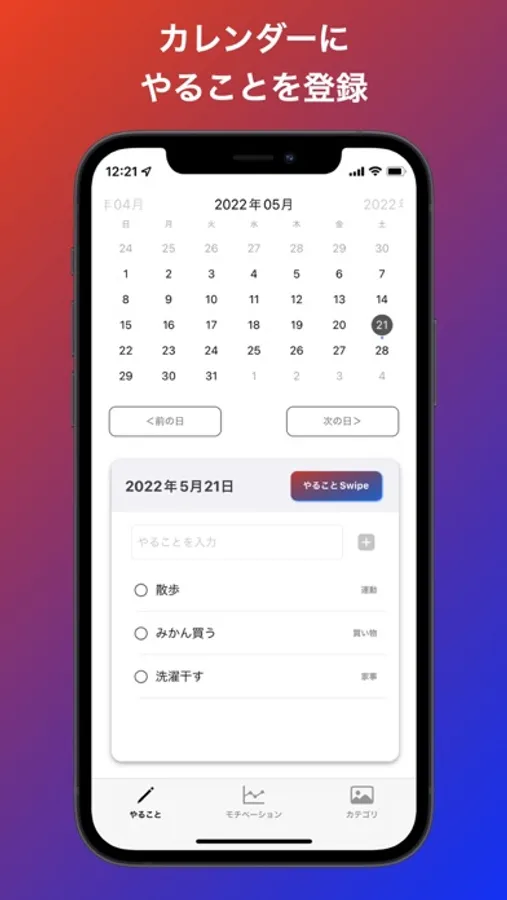 ・仕事、運動、家事、また料理、読書、買い物、勉強、子育て、副業などToDoをカテゴリで分けて登録することができます。