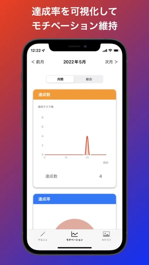 ・ToDoの達成数をモチベーショングラフ、達成率を円グラフ、達成カテゴリ率を円グラフで表示しています。月間、総合と選択が可能です。