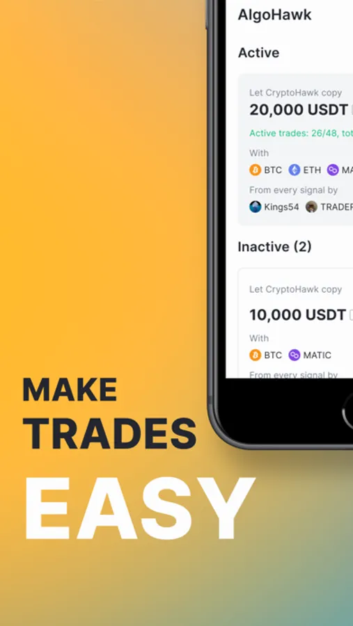 Make confident and profitable trades with our high-accuracy trading signals. Automatically copy trade the expert traders with customizable entry, stop-loss, and take profit features. Stay updated with our in-app trading guide, breaking news, and news summary. Get instant notifications and easily monitor all your trades in one place. Start your successful crypto trading journey today!