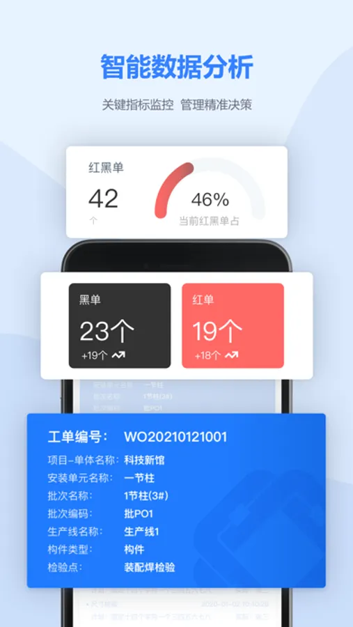 通过系统可查询到项目每一根构件的生产进度,工厂可在网页端或手机App扫码,可实现构件的快速报工报检,最终生成产量数据报表,减少繁重的报表统计工作;对于构件基础信息和生产发运等信息也可进行实时跟踪、追溯,打破信息孤岛,实现生产透明化、数据可视化 。