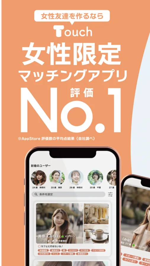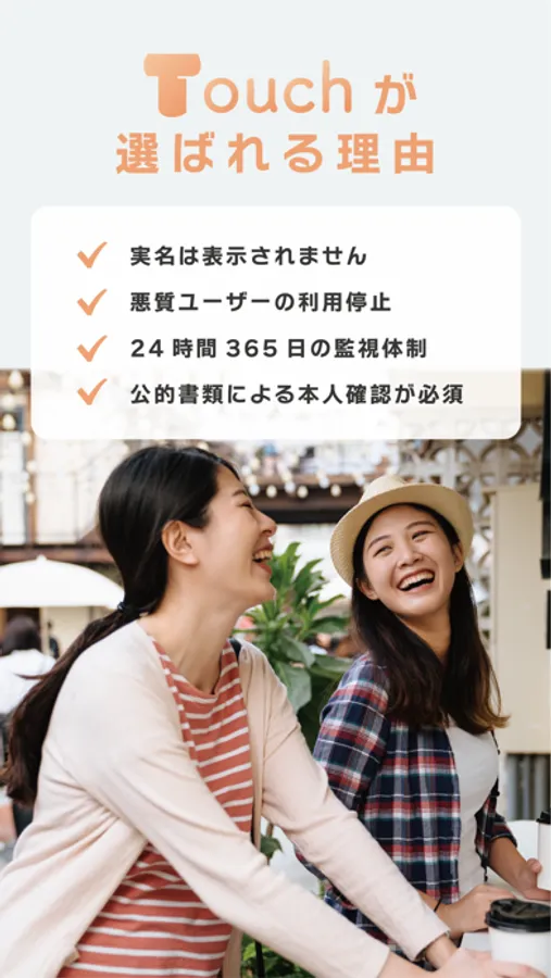 Touchは、女友だちとつながるための女性限定マッチングサービスです。「彼氏じゃなくて、女友だちがほしい!」という声がきっかけで生まれ、ライブや食事に一緒にいったり、写真を撮りあったり、遊びにいったりする友だちと出会いたいという多くの女性ユーザにご利用いただけます。