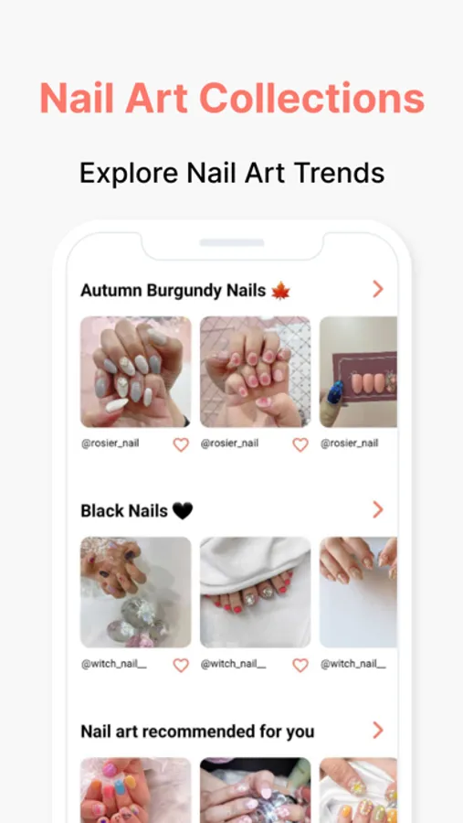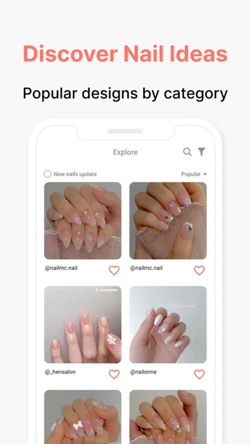 Do you like simple styles? Or do you want fancy nails? In NAILY you can collect all the nail designs that are popular right now depending on the category you want. From neat one-tone nails to colorful and shiny nails! NAILY is a perfect application for getting nail art design ideas from millions of examples! Take a look at the popular nail polishes, acrylic nails, gel nails, and nail patterns.