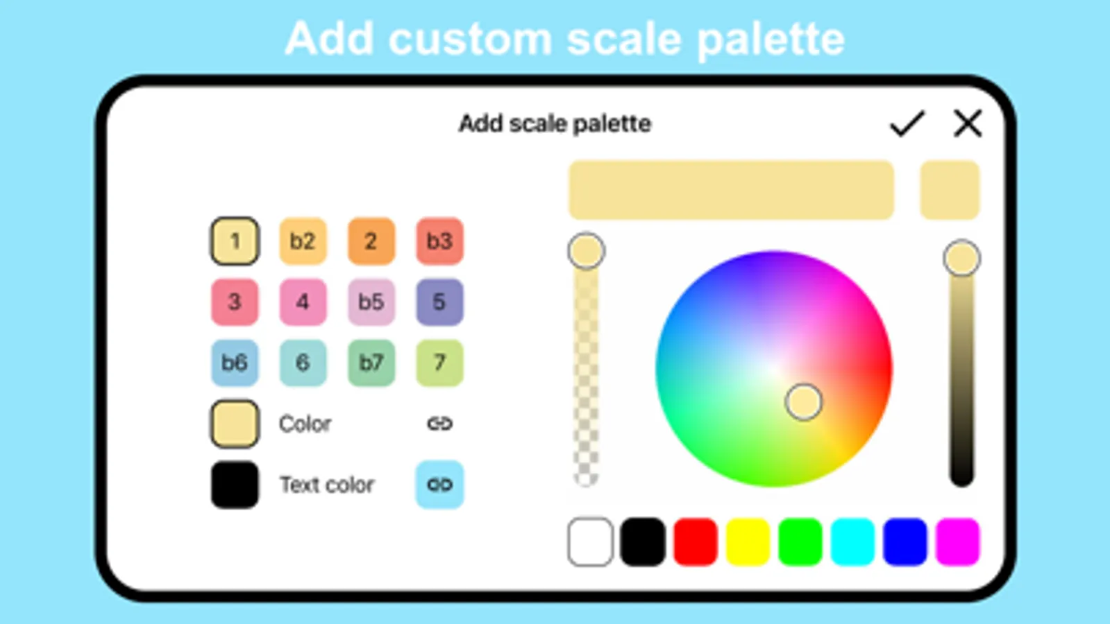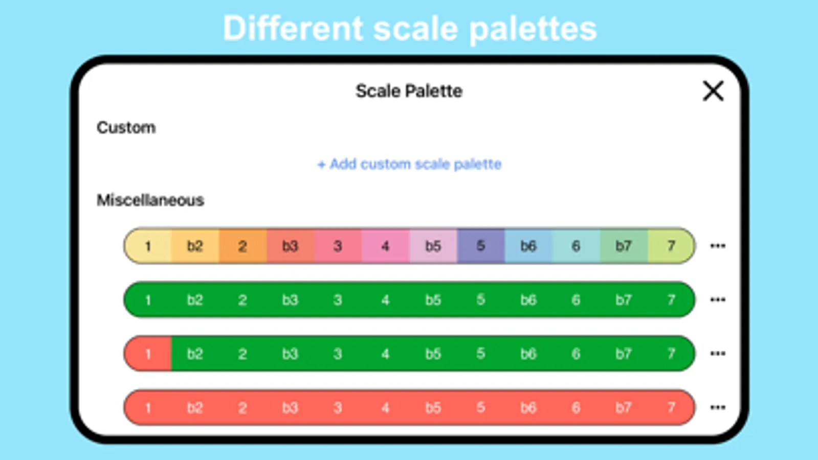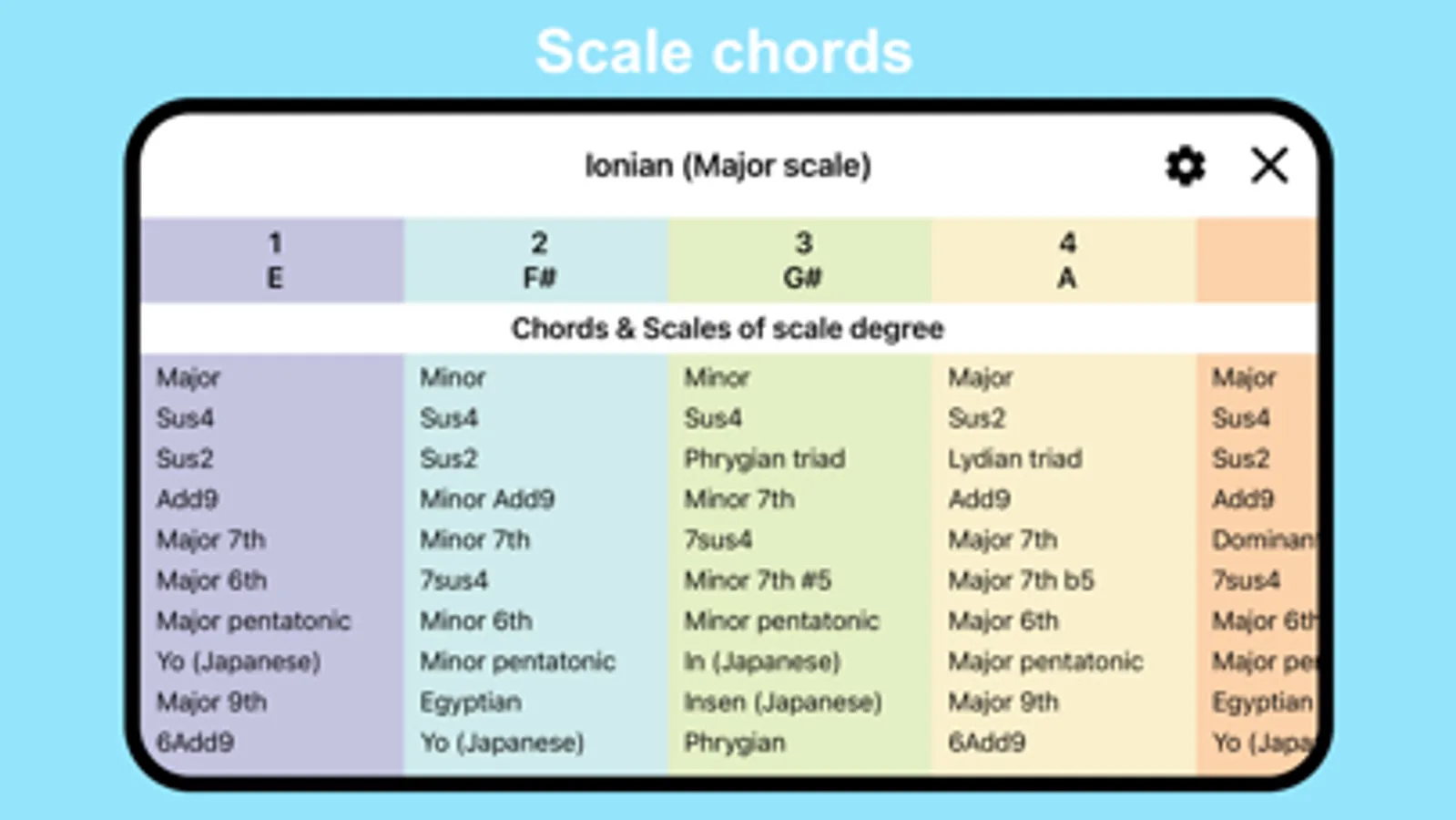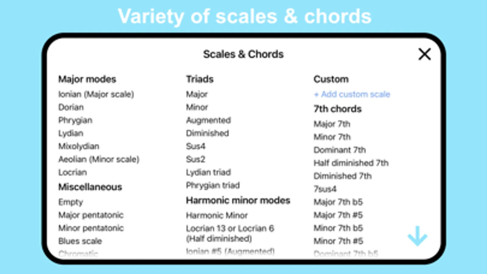 - 45+ scales (Major scale modes, Harmonic minor scale modes, Melodic minor scale modes, Major/Minor pentatonic, Exotic scales, Bebop scales) and 35+ chords