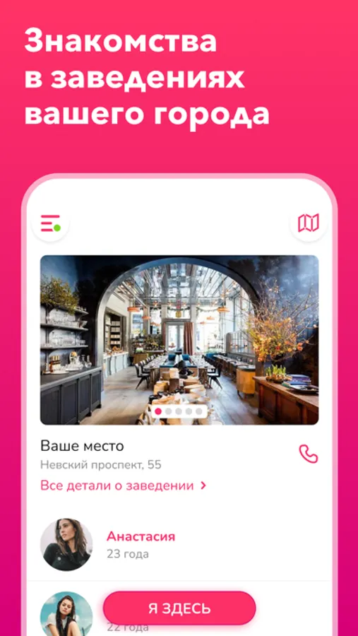 4. Видите, кто именно находится в этом же заведении или соседних, в радиусе 200 метров, и с какой целью знакомства.