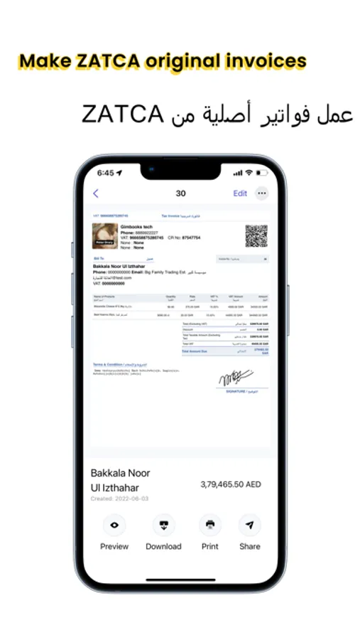 Invoice Maker by GimBooks provides an easy way to create Invoices, ZATCA Compliant E-Invoice with QR Codes and manage accounts. You can create and manage invoices, e-invoices. Manage your Inventory, bill book and your full business through ZATCA Compliant Easy Invoice by GimBooks.