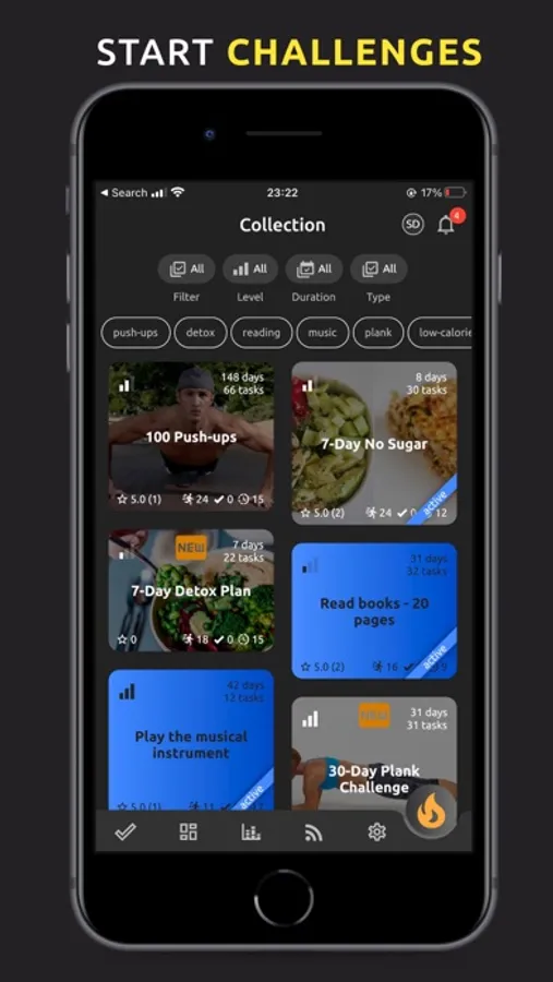 You can choose practices related to various topics: nutrition, body, spirit, emotions, and others. The challenge library is constantly updated on daily basis. There are reminders here so you don't forget about your practice. Levels of difficulty in the application are also different, such as easy, moderate, and hard.