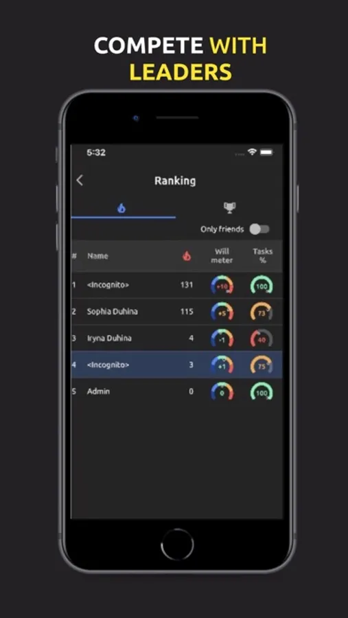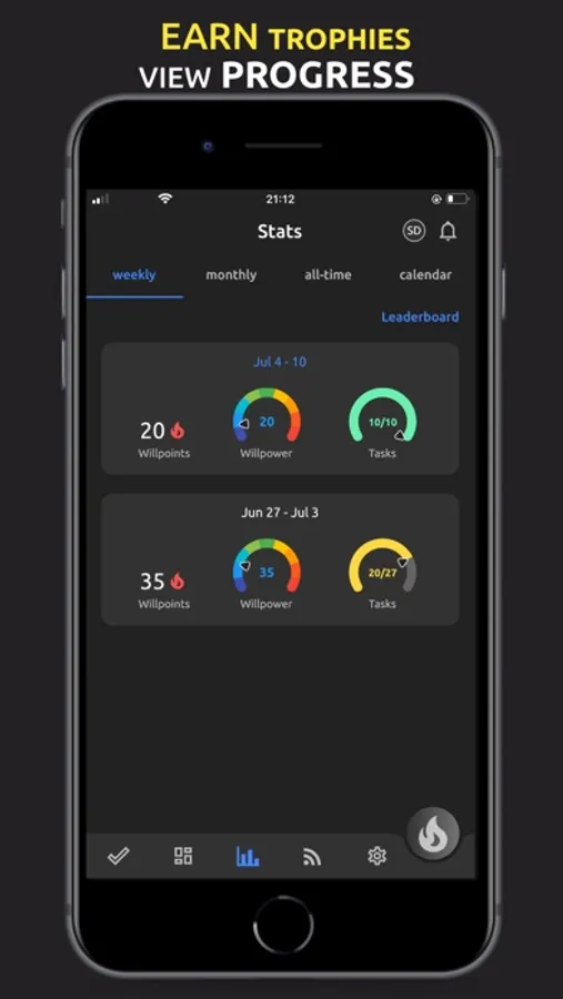 Track your progress weekly and monthly within the Stats page. Compete with other challengers using willpoints and trophies. It helps to push yourself and get better.