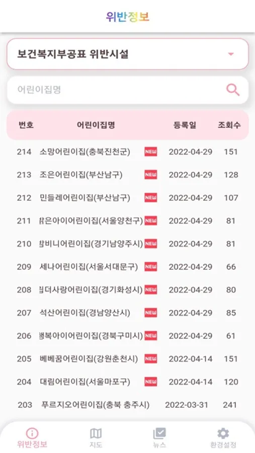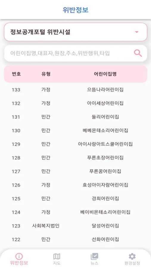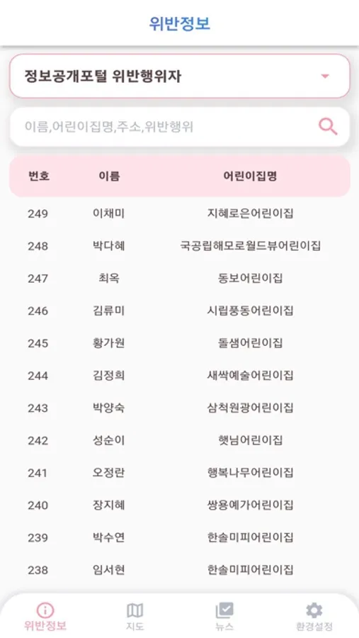 - 어린이집명, 위반 행위자 실명으로 위반 사항 검색하기