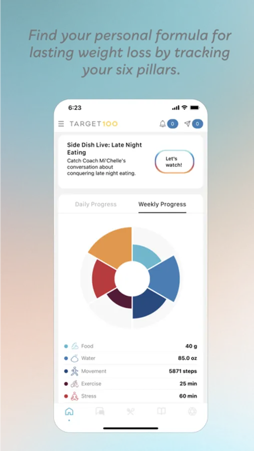 Lose weight for the last time. Welcome to Target100—an app that helps you realize your personal and weight loss goals through six pillars: food, water, steps, exercise, sleep, and stress. You'll be coached by experts, supported by our community, and inspired by what you learn every step of the way.