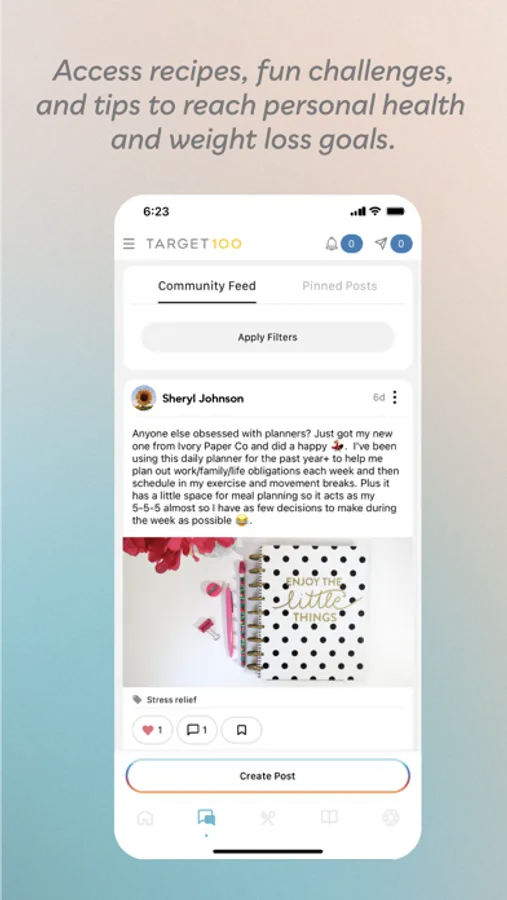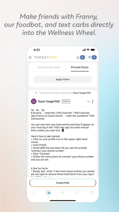 Gain access to our amazing Target100 community of coaches and peers in the app. Post questions, status updates, get accountability and support, and so much more on our community wall.