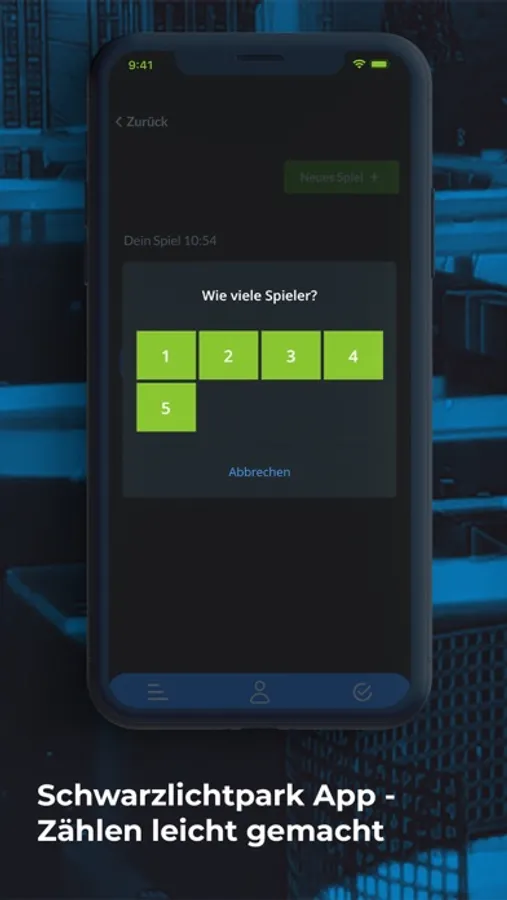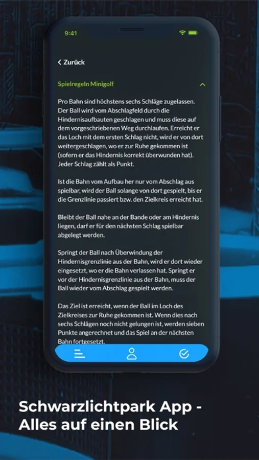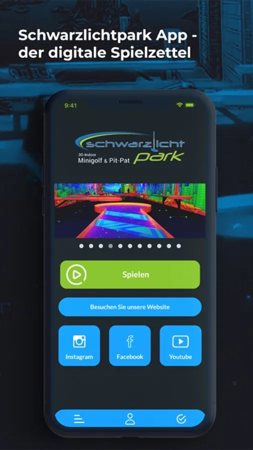 Unsere Schwarzlichtpark App bietet einen digitalen Spielzettel für bis zu 5 Mitspieler. Einfach benötigte Schlagzahl eingeben und das Ergebnis wird immer aktuell angezeigt.