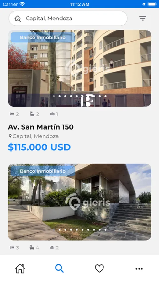 Con la aplicación de Gieris vas a poder realizar búsqueda de inmuebles, encontrar propiedades en venta y alquiler.
