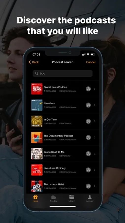 Fox News, Freakonomics Radio from Stitcher, Call Her Daddy, Phil in the Blanks by Dr. Phil, Bill O'Reilly, Today, Explained from Vox and Stitcher, S Town, The Luminary Agent Podcast, BBC iPlayer Radio, Criminal, Heaven's Gate from Stitcher, Dan Carlin's Hardcore History, ESPN Radio, My Favorite Murder, NPR, Radiolab, Serial, Sleep with Me, Stuff You Should Know, Sword and Scale, TED Radio Hour, TEDTalks, The Dave Ramsey Show, LeVar Burton Reads from Stitcher, The Joe Rogan Experience, The Tim Ferriss Show, Wolverine from Marvel and Stitcher, Luminary podcast from Luminary.fm, Luminary Business with Todd Staples, Olympik iPlayer Podcasts, You are dead to me by BBC Sounds, Friday Night Comedy from BBC iPlayer Radio, Brexitcast by BBC Sounds and iPlayer Radio, Comedy of the Week by BBC iPlayer Radio, etc.