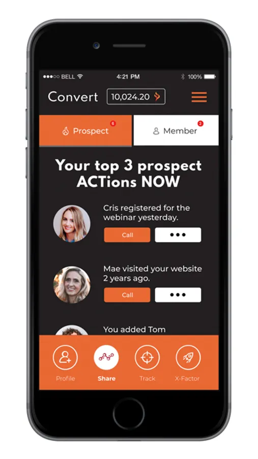 The application tracks all of your invitations to contacts, their responses, and offers "suggested text" (known as "predictive actions") so you can follow up with every person with whom you have shared your business.