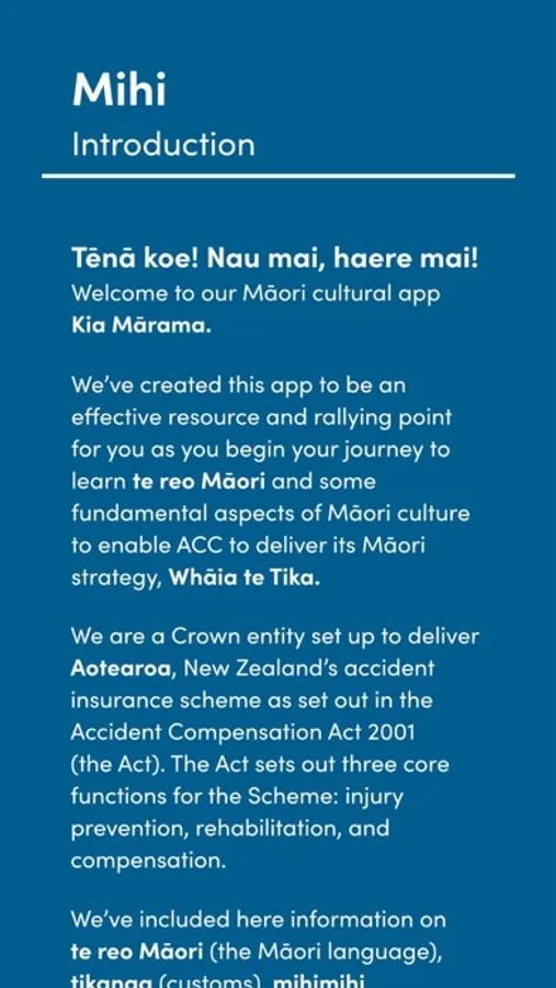 We’ve created this app to be an effective resource and rallying point for you as you begin your journey to learn te reo Māori and some fundamental aspects of Māori culture. We’ve included here information on te reo Māori (the Māori language), tikanga (customs), mihimihi (introductions), whakataukī (proverbs) and waiata (songs), to help you understand more about our unique and shared cultural heritage.