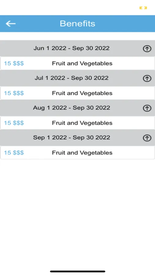 Benefits displays the available quantity and description of the current and future household benefits. The calculator for Fruits and Vegetables helps calculate the cost of fruits and vegetables.
