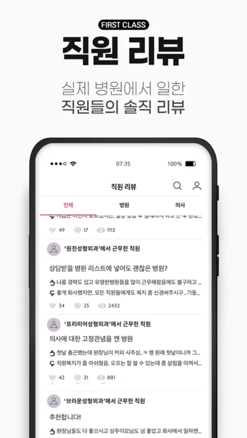 직원리뷰 : 병원 직원들의 생생한 리뷰를 확인할 수 있어요.