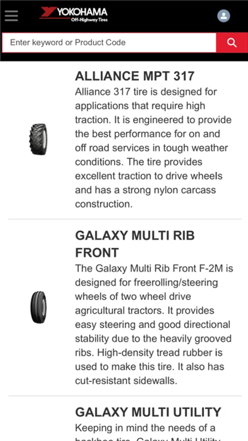 Yokohama Off-Highway Tires’ B2B E-Commerce app brings the Yokohama, Alliance, Galaxy and Primex brands right to our customers’ mobile device, allowing them to order a wide range of off-highway tires for farming, forestry, lawn and turf, construction, mining, material handling, ports, and other challenging environments.