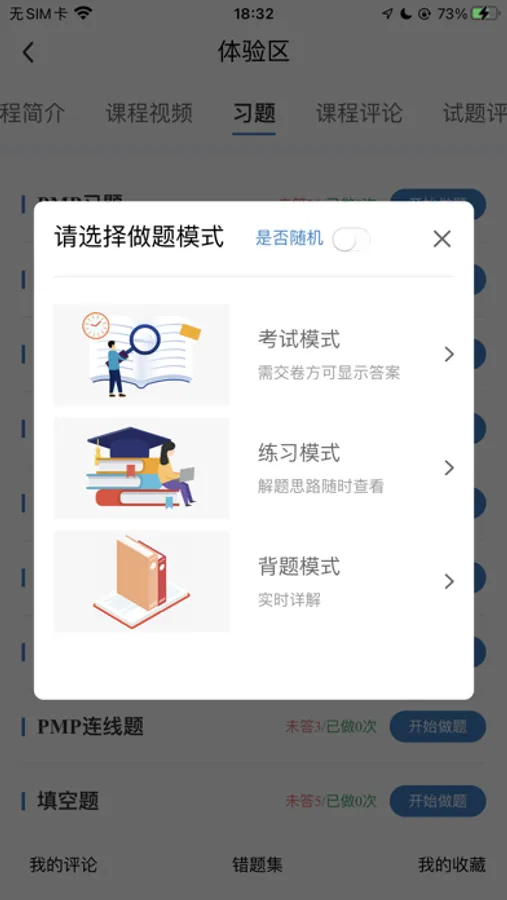 APP内拥有多种模式(练习、考试、背题),让学员充分掌握知识点,顺利通过考试。通过观看直播视频、线上做题、模拟考试等方式,学员可自行掌握学习进度。