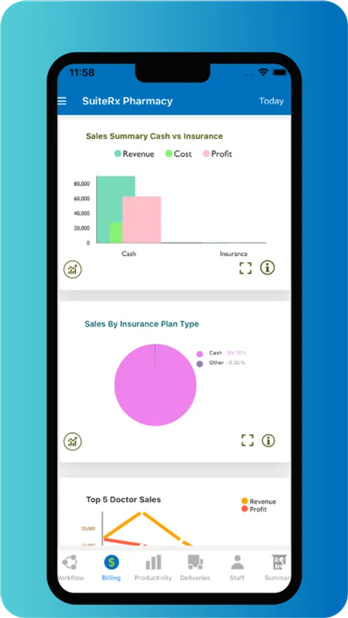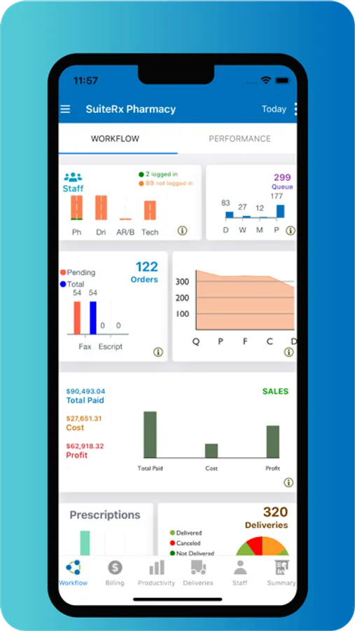 SrxAffinity provides views of almost real-time business performance by aggregating metrics from prescription, drug, and billing data, and converting it into actionable data for single or multi-site locations. Use tools that allow you to filter and view your data with an at-a-glance comparison of business metrics. View pre-built or tailored custom reports that you currently use in SRx. Experience day by day control by viewing data so you are prepared for anything. Operations are broken down by workflow, billing, productivity, deliveries, staff, and summary categories. Monitor trends, discover anomalies, identify strengths and weaknesses to examine the health of your business.