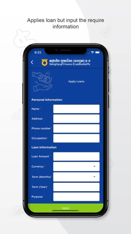 It is easy – if you already have an NongHyup Loan/Account and registered mobile phone number with us, just download the app from your app store and follow the screen instructions to start banking with NongHyup or You can also take your smartphone and visit the nearest NongHyup Finance (Cambodia) branch to apply for the service.