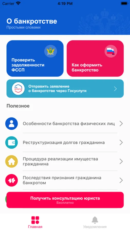 Приложение Банкротство позволяет узнать задолженность и решить, как действовать дальше в непростой жизненной ситуации.