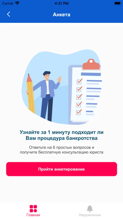 Приложение Банкротство поможет избавиться от долгов и пройти процедуру с наименьшими потерями. Установите приложение, изучите этапы банкротства с помощью сервиса и узнайте долги по кредитам и займам. В случае затруднений вам поможем юрист онлайн.