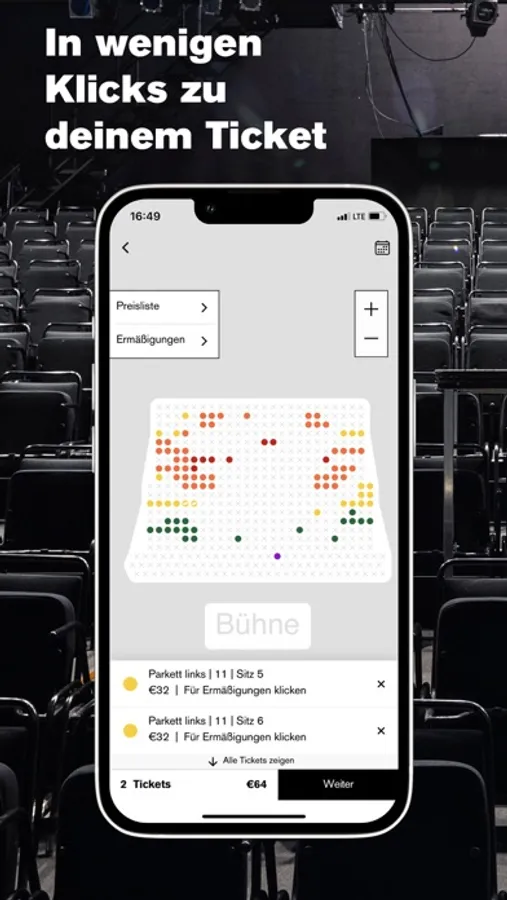 Wähle deine gewünschte Veranstaltung, suche dir deinen Platz im Saalplan aus und in wenigen Klicks hast du dir dein Ticket gesichert. Es ist direkt in der App gespeichert, sodass du es nur noch beim Einlass vorzeigen musst.