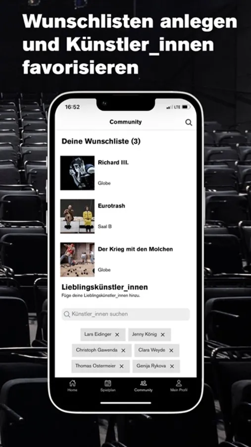 Lege dir deine persönliche Wunschliste an, mit Stücken, die du auf keinen Fall verpassen möchtest. Oder markiere deine Favoriten und werde informiert, sobald es Neuigkeiten gibt – dein_e Lieblingsschauspieler_in oder Lieblingsregisseur_in sind vielleicht bald schon wieder im Programm zu finden!