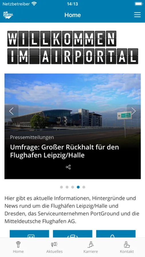 AIRPORTAL ist eine Informationsplattform der Mitteldeutschen Flughafen AG mit ihren Tochtergesellschaften Flughafen Dresden, Flughafen Leipzig/Halle und PortGround. Hier finden Sie aktuelle Nachrichten und Wissenswertes aus den Flughäfen. Sie können sich über neue Entwicklungen im Unternehmen, der Luftfahrt, anderen Branchen und Bereichen wie Umweltbemühungen, Karriere oder Events selbst informieren. Es ist auch möglich, mit den mitteldeutschen Flughäfen in direkten Dialog zu treten.