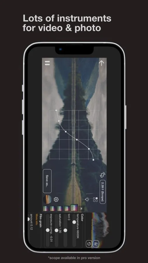 The application provides a set of >70 filters containing profiles of popular vintage Kodak Vision3 films, black-and-white filters and filters for cinema post-processing. You also have the option of manually preprocess color by changing the temperature, tint, saturation and color correction curve. You can track all changes in the distribution of colors in a frame using a color histogram.