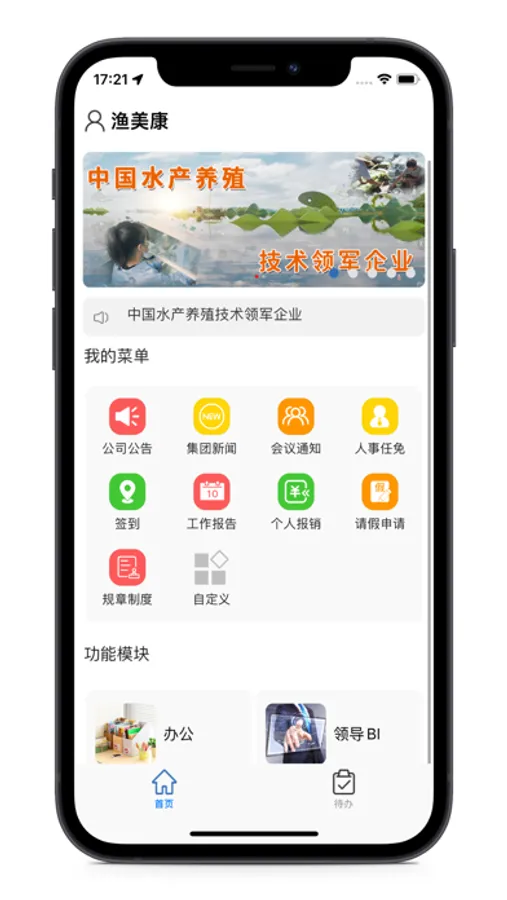 渔美康系统,集成个人平台,领导查询,待办事项等模块, 让您随时随地体验掌上办公。