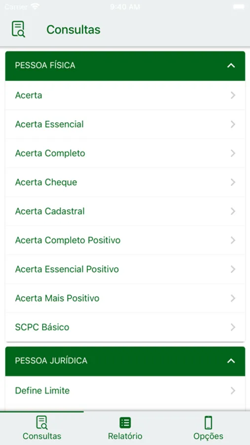 Além das consultas mais habituais, e o score de crédito, também estão disponíveis neste aplicativo as consultas das famílias Acerta e Define.