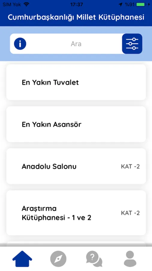Cumhurbaşkanlığı Millet Kütüphanesi’nde görme engelli okuyucularımızın hizmetine sunulmak üzere “Sesli Adımlar” uygulaması geliştirilmiştir. Uygulama ile kütüphane içerisinde istediğiniz lokasyonu arayabilir ve istediğiniz lokasyona, en yakın asansöre, danışma bankosuna, mescit, tuvalet gibi alanlara yönlendirme alabilirsiniz.