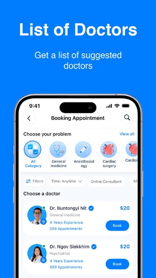 No long clinic queues. Worry no more! Choose from all specialists in Cambodia. Book appointments for Dentists, Dermatologists, Gynaecologists, Pediatricians, Psychiatrists, Urologists, Orthopedists, and more specialities.