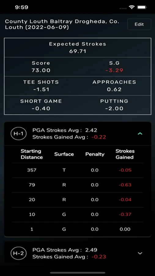- Below the circles you can see "My Rounds". Here you can examine overall round stats as well as Strokes Gained data on each shot!