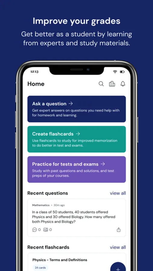 The explore section is a personalized study feed consisting of test preps, flashcards, past questions, study sets by other students all tailored to your subject's interests and school level.